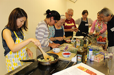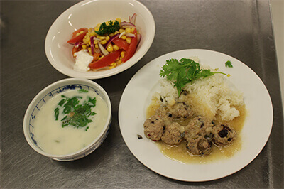 皆で様々な料理を作ります。一皿目は「ピスカ・アンディーナ」。じゃがいも、コリアンダー、卵が入った温かく美味しいスープです。元はベネズエラのアンデス地方の料理ですが、今ではベネズエラ全土でよく食べられます。メインディッシュは肉団子の煮込み。小さな肉団子にはレーズン、刻んだ黒オリーブと緑オリーブが入っており、何とも特別な風味があります。ガーリックライス、トマトとスイートコーンのサラダを添えました。最後はデザート。パイナップル、ナツメグ、バジルを黒砂糖とバターのカラメルソースで和え、バニラアイスを添えました。手際よく調理してきた受講生の皆さん、テーブルに着き食事を楽しむと、大満足の様子でした。