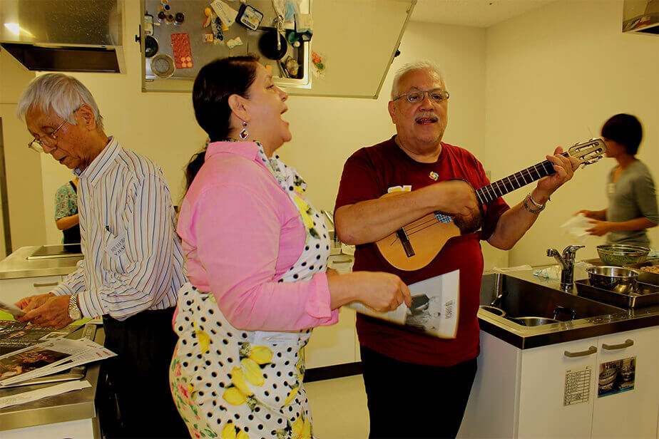 料理教室の最後には特別に「もう一品」。音楽家でもあるレイナ講師が、ベネズエラの四弦ギター「クアトロ」をサプライズで演奏し、受講生はびっくり。ベネズエラの曲”Amalia Rosa”の歌詞を配布し、皆で歌いました。楽しい時間はあっという間、素敵な会となりました。